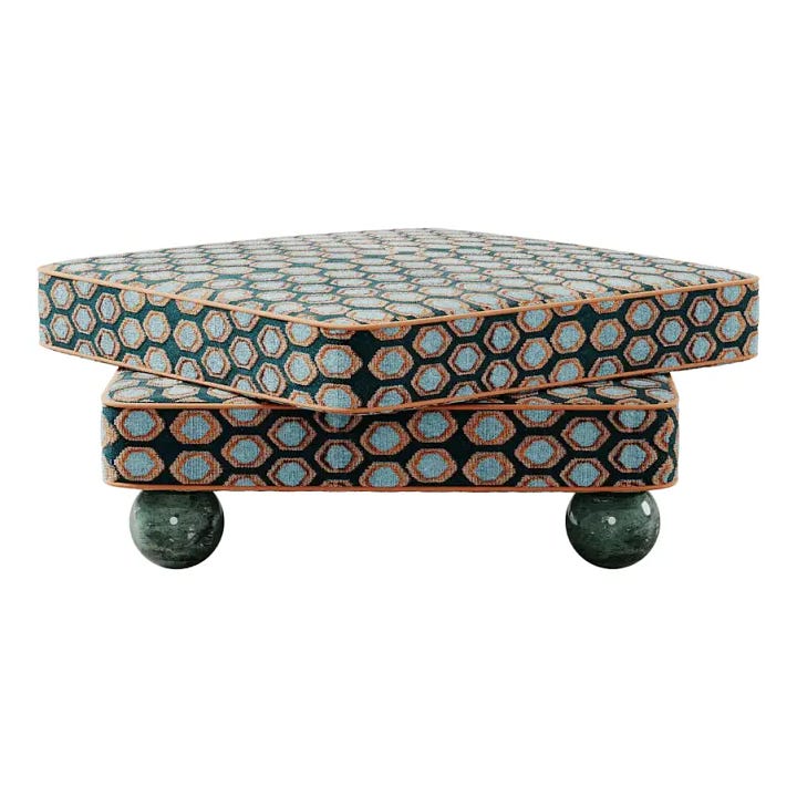 Chairish ottoman on the left, custom ottoman by Alice Crawley Interiors on the right If you don’t like how your existing coffee table looks and you want a cheap fix, find a beautiful fabric and drape it over. I’ve seen this done very well.