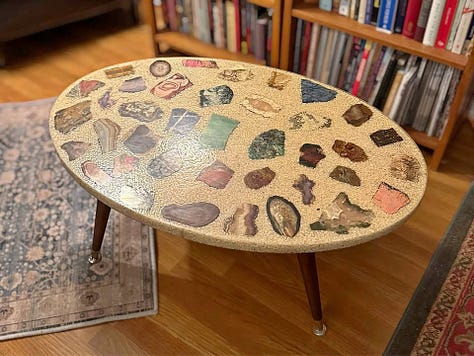 A unique coffee table with a cool stone inlay collection. Great coffee tables are hard to find. This is so cool, and a conversation starter