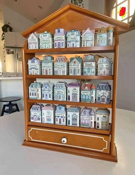 An adorable spice village! Each spice home is labeled with the spice. This is a far more charming way to store spices than my ugly spice rack and ugly spices, if you don’t have cabinet or drawer space like me